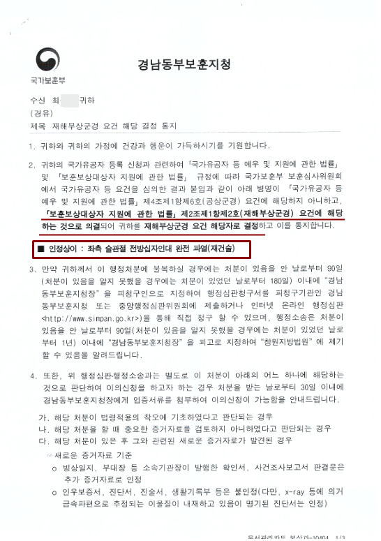 ¾È³çÇϼ¼¿ä. ÇàÁ¤»ç¹«¼Ò ÇØ¿ÃÀÔ´Ï´Ù.À̹ø¿¡ ÀÇ·ÚÇØÁֽŠÃÖOO´Ô(1980³â»ý)²²¼´Â 2002³â À°±º º¹¹« Áß ºÎ´ë ³»¿¡¼ ½Ç½ÃµÈ TOPÈÆ·Ã µµÁß, ´ëÇü ŸÀ̾î Á¡ÇÁ ÂøÁö °úÁ¤¿¡¼ ÁÂÃø ¹«¸ÀÌ ²ªÀÌ¸ç ºÎ»óÀ» ÀÔÀ¸¼Ì½À´Ï´Ù.ÀÌÈÄ ÁÂÃø ½½°üÀý Àü¹æ½ÊÀÚÀÎ´ë ¿ÏÀü ÆÄ¿ Áø´ÜÀ» ¹Þ°í Àç°Ç¼úÀ» ½ÃÇàÇÏ¿´À¸³ª, ¼ö¼ú ÀÌÈÄ¿¡µµ ÅëÁõÀÌ Áö¼ÓµÇ¾î ÀúÈñ ÇàÁ¤»ç¹«¼Ò ÇØ¿Ã¿¡ ÀçÇØºÎ»ó±º°æ µî·Ï ½ÅûÀ» ÀÇ·ÚÇϽŠ»ç·ÊÀÔ´Ï´Ù. À§ »ç·Ê·Î "ÁÂÃø ½½°üÀý Àü¹æ½ÊÀÚÀÎ´ë ¿ÏÀü ÆÄ¿(Àç°Ç¼ú)"ÀÌ ÀçÇØºÎ»ó±º°æ ¿ä°Ç¿¡ ÇØ´çÇÑ´Ù´Â ÅëÁö¸¦ ¹Þ¾Ò½À´Ï´Ù.Á¤È®ÇÑ ÀÚ·á ¼öÁý°ú ¸é¹ÐÇÑ °ËÅ並 °ÅÃÄ º¸ÈƽɻçÀ§¿øÈ¸ÀÇ ½ÉÀÇ¡¤ÀÇ°á °á°ú,⌈º¸ÈÆ´ë»óÀÚ Áö¿ø¿¡ °üÇÑ ¹ý·ü⌋ Á¦2Á¶Á¦1Ç×Á¦2È£(ÀçÇØºÎ»ó±º°æ) ¿ä°Ç¿¡ ÇØ´ç ÇÏ´Â °ÍÀ¸·Î ÀǰáµÇ¾î ÅëÁö ¹ÞÀº ³»¿ë ÀÔ´Ï´Ù. °ø¹«¿ø ÀåÇØ¿¬±Ý ¹× ±¹°¡À¯°øÀÚ µî·Ï, º¸ÈÆ´ë»óÀÚ µî·Ï µî º¸»óºÎºÐ¿¡ °ü·ÃÇÏ¿©±Ã±ÝÇÑ »çÇ×ÀÌ ÀÖÀ¸½Ã´Ù¸é ¾ðÁ¦µçÁö ¹®ÀÇ ÁÖ¼¼¿ä.ȨÆäÀÌÁö »ó´ã±Û ¶Ç´Â ÀüÈ Áֽøé Ä£ÀýÇÏ°Ô µµ¿Íµå¸®°Ú½À´Ï´Ù.°¨»çÇÕ´Ï´Ù.